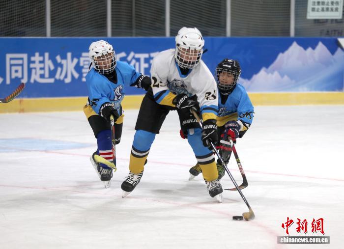 今日青海西宁,青少年组角逐中,乡中区代替队(蓝衣)对于阵湟中区代替队(黑衣)。青海省第109届行动会冰球名目同吸收去自该省5收部队、103实选脚参赛。中新社记者 弛忠苹 摄