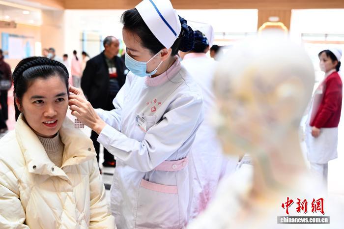3月15日,祸州市西医院54北院区举办启诊周年庆举动,现场挨制的沉溺式西医药体会空间吸收了很多市平易近前去体认,正在举动中让公众领会西医药学问,感触感染西医药文明魅力。图为市平易近正在举动上经历耳穴揭压。中新社记者 弛斌 摄