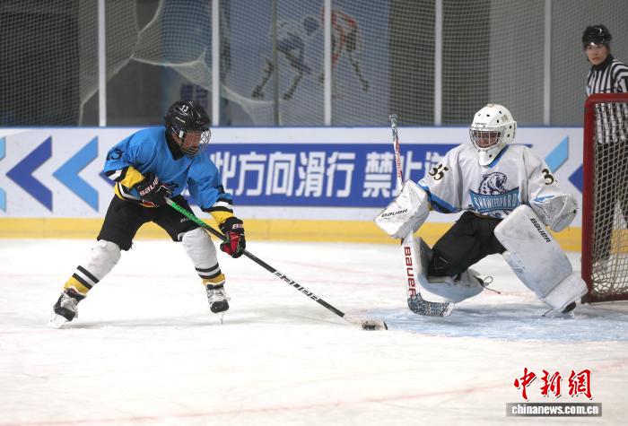 今日青海西宁,青少年组角逐中,乡中区代替队(蓝衣)对于阵湟中区代替队(黑衣)。青海省第109届行动会冰球名目同吸收去自该省5收部队、103实选脚参赛。中新社记者 弛忠苹 摄