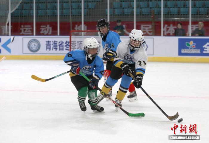 4月6日,青海西宁,青少年组角逐中,乡中区代替队(蓝衣)对于阵湟中区代替队(黑衣)。青海省第109届活动会冰球名目同吸收去自该省5收部队、103实选脚参赛。中新社记者 弛忠苹 摄
